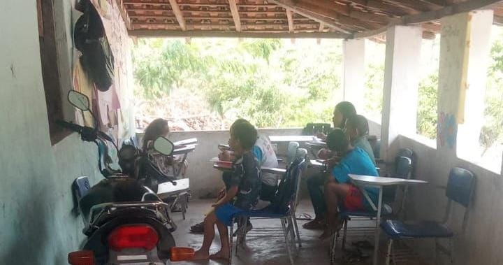 Alunos da rede municipal de ensino de São Benedito do Rio Preto (MA) foram flagrados assistindo aulas na varanda de uma casa, no povoado Vila Bena, por não haver sala de aula disponível ou estrutura mínima para o ensino.
